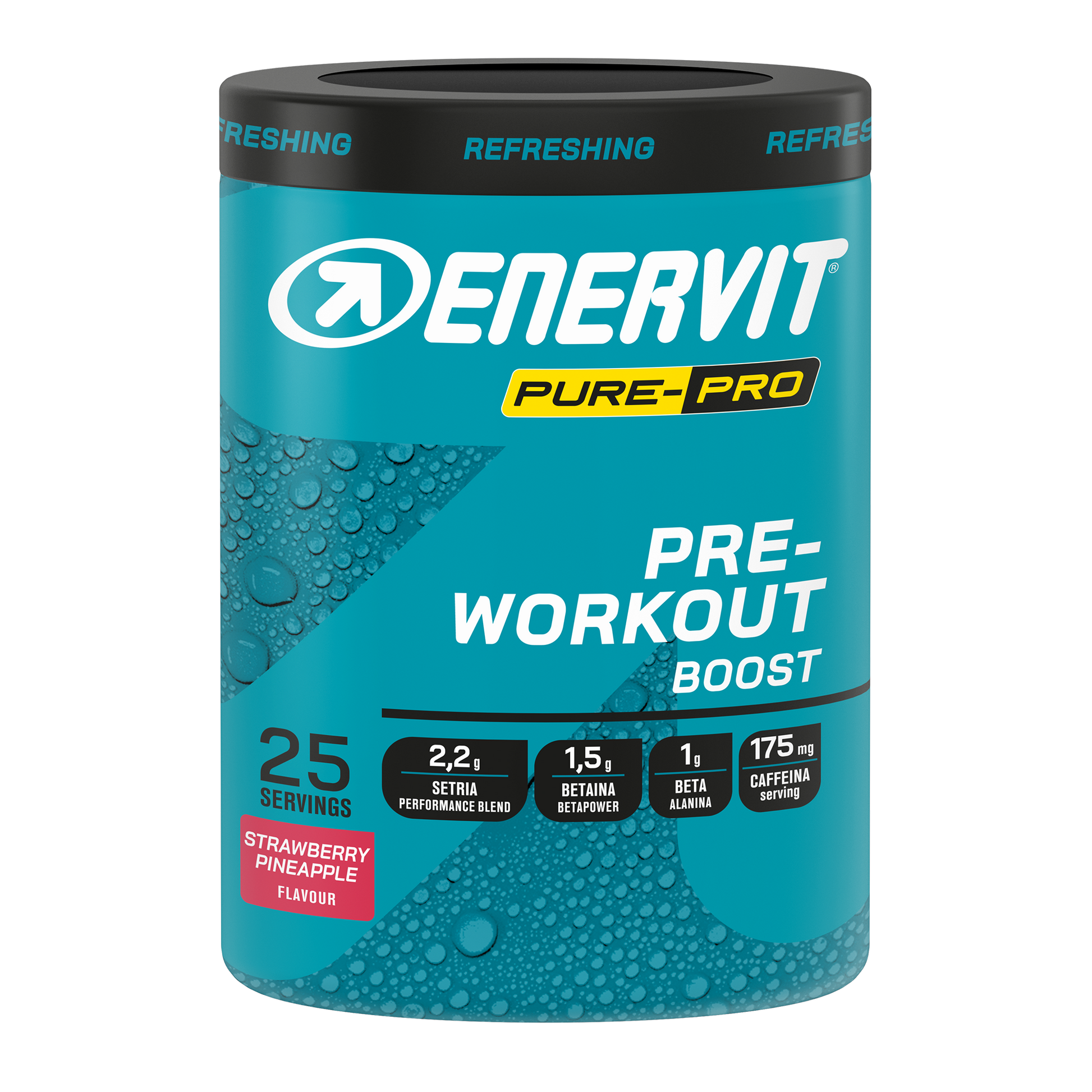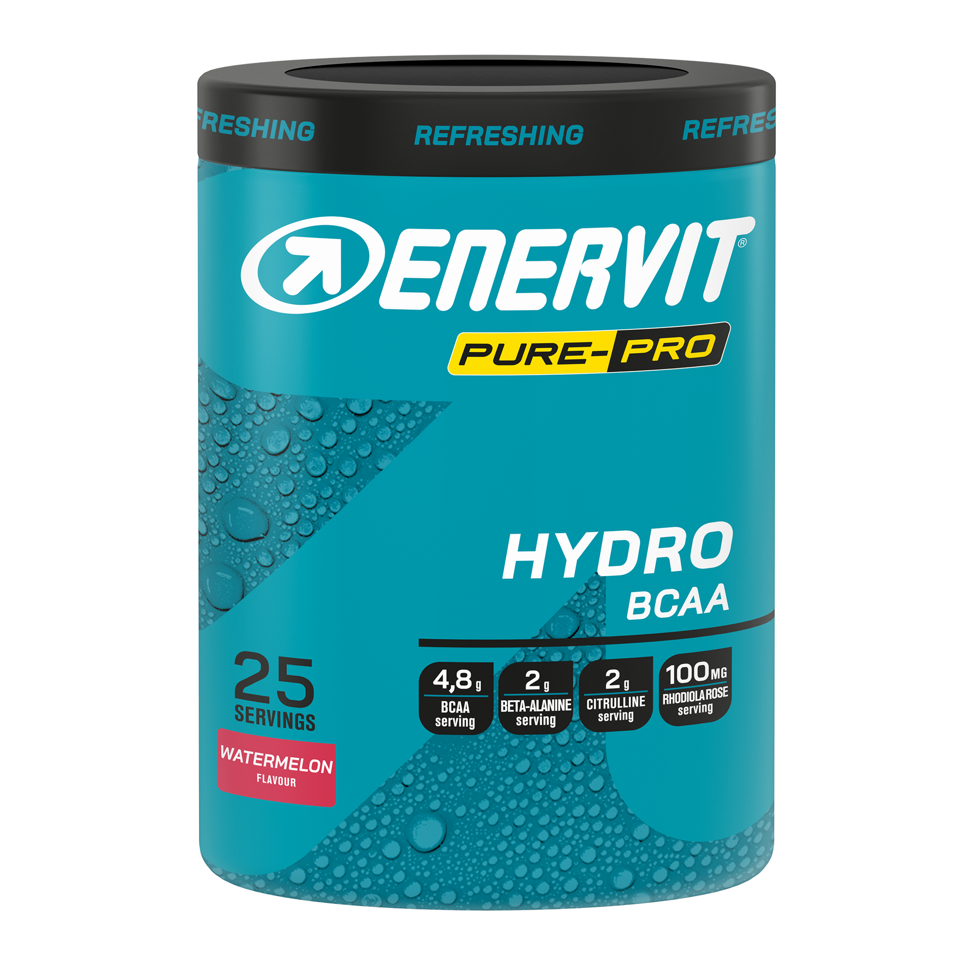 Enervit PURE-PRO Hydro BCAA is a drinkable branched-chain amino acid supplement with refreshing watermelon flavor, designed to support protein synthesis and reduce fatigue during intense training sessions.