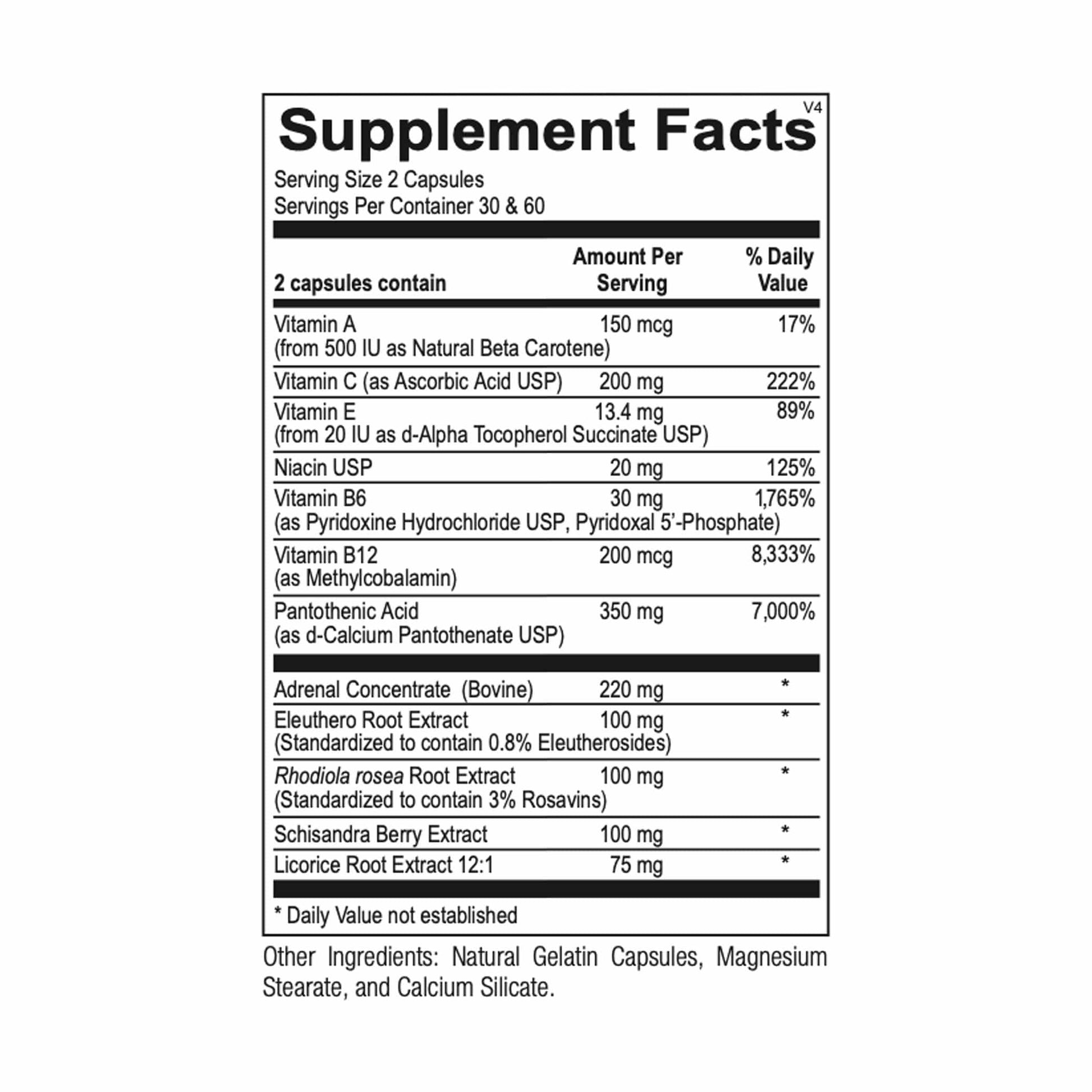 Stress-buffering botanical blend of potent adaptogens (a substance which creates balance in the body with no side effects), which supports your body's ability to withstand mental and physical stress. Adaptogens such as Eleuthera, Rhodiola rose, schizandra, and licorice root extract that have been shown to slow the conversion of Cortisol to its inactive form cortisone, supporting adrenal gland function, boosting cortisol levels. improving mental focus, reducing fatigue and enhancing immune response