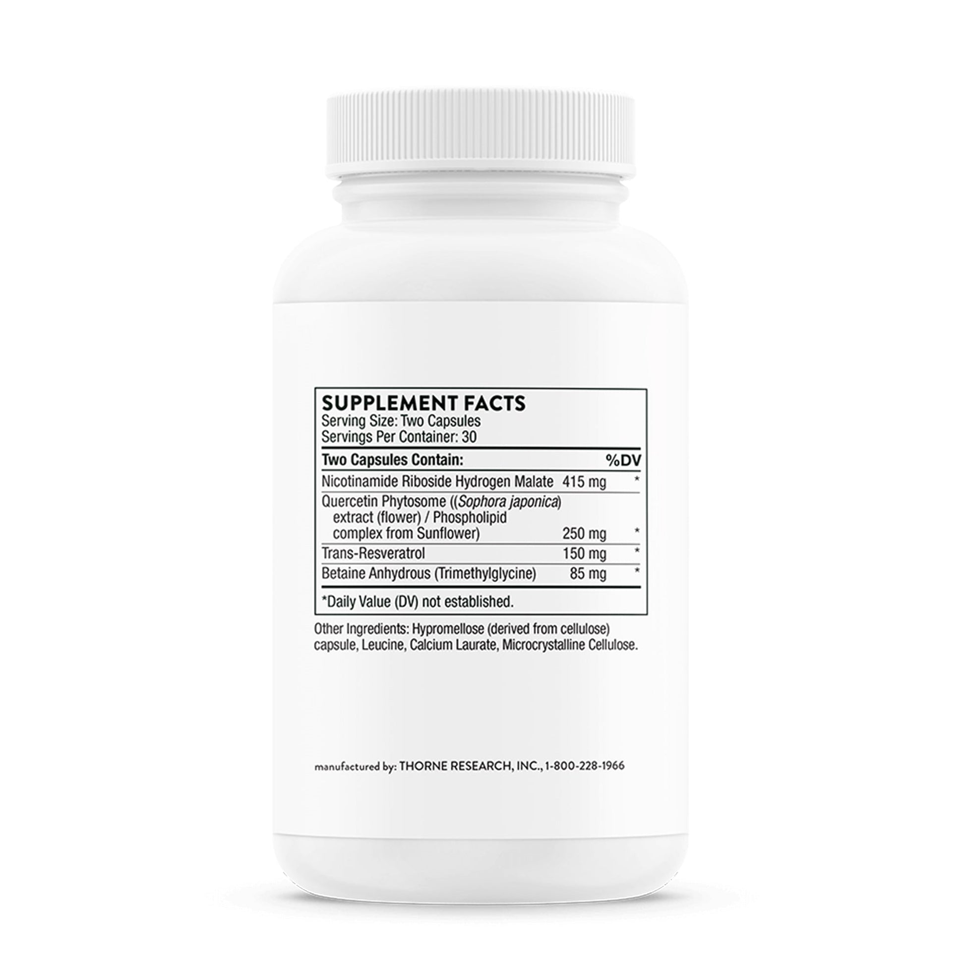 Thorne has included Quercetin, Betaine and Nicotinamide riboside (aiding in ATP production) in ResveraCel to support and boost your body’s response to this pure form of Resveratrol.