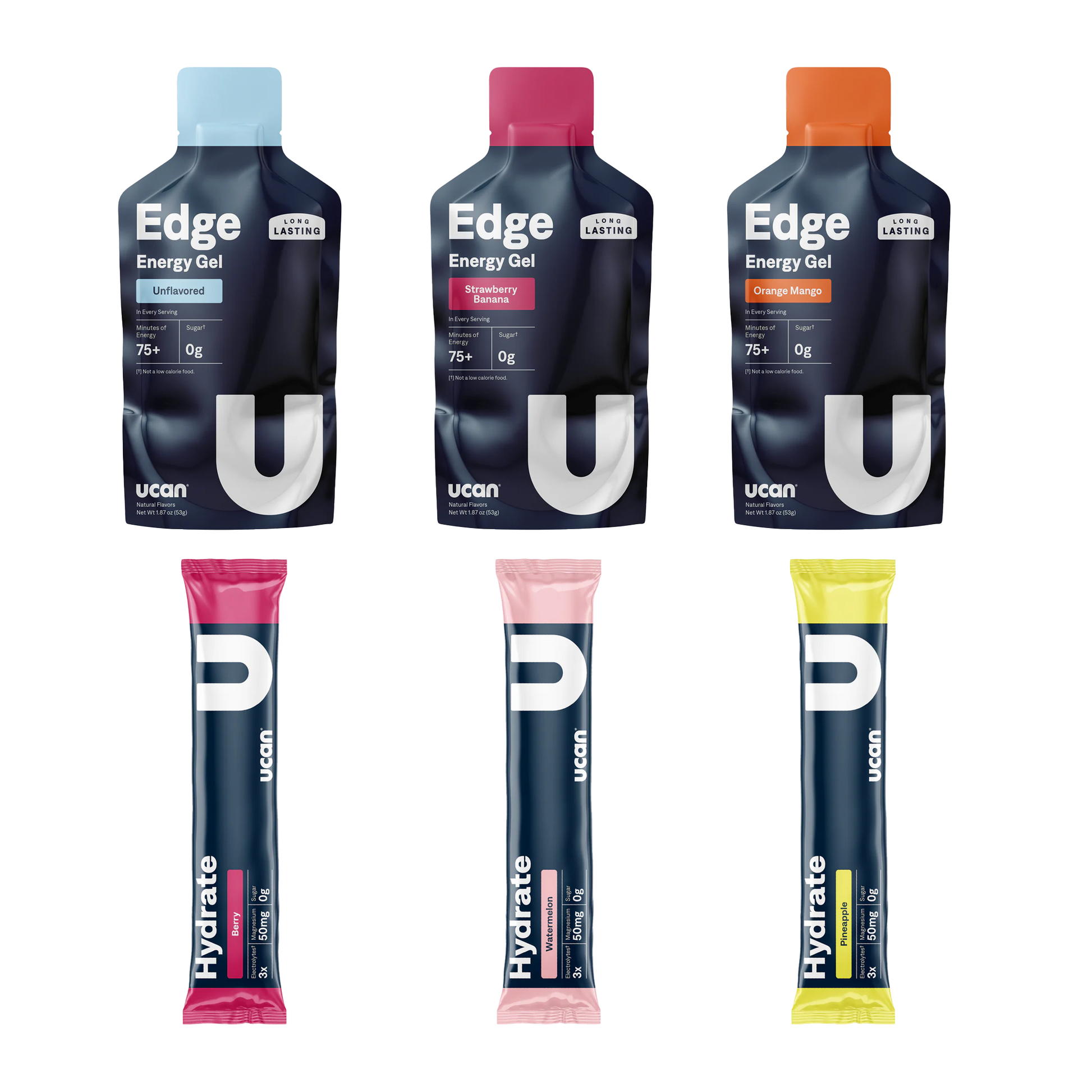 These great-tasting, sugar-free energy gels from UCAN deliver hours of steady-release energy to power peak performance. The Edge is a special gel. They use a slow-burning, sugar-free, ultra low-glycemic carbohydrate derived from non-gmo corn. They call this LIVSTEADY; it sets them apart from standard gels on the market that provide short blasts of sugar. Instead, it's a slower time-released carbohydrate.