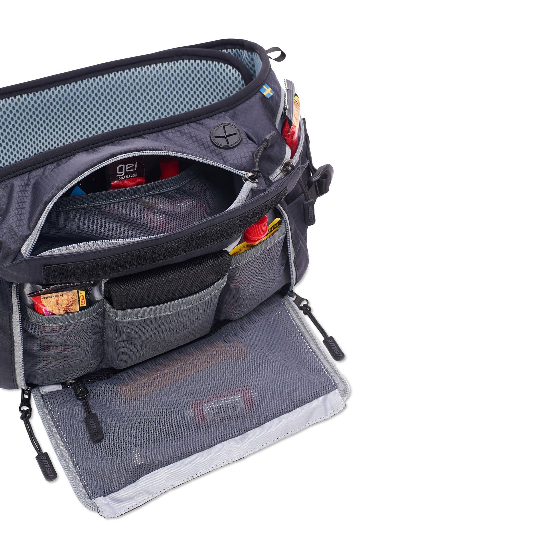 The pack is carrying 6 liters of storage capacity, equipped with a big main compartment, a multi organizer pocket and two pockets for quick access to energy gels and food.